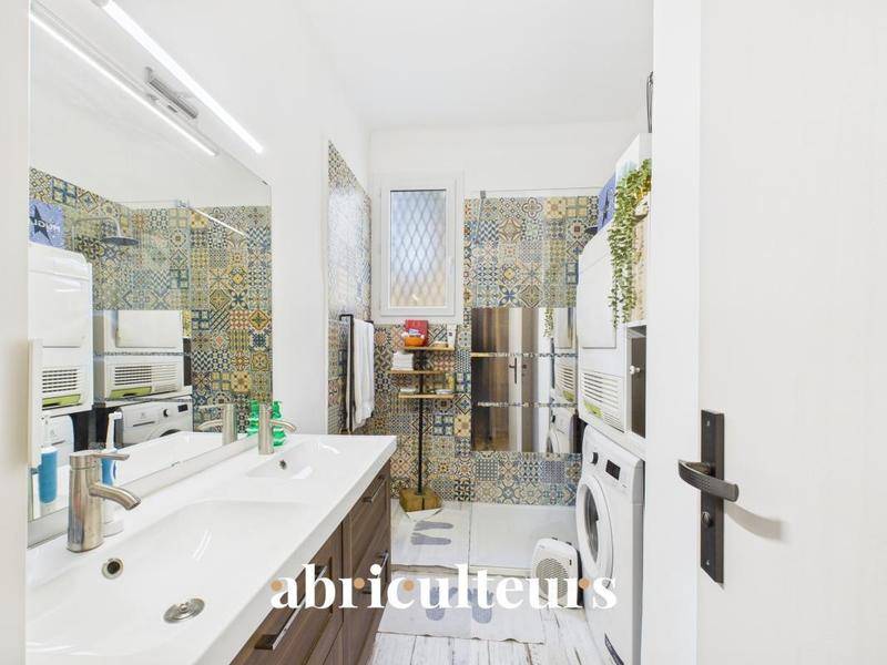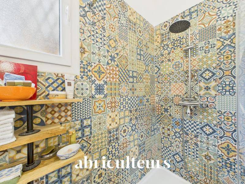 Côté nuit, l’appartement dévoile une chambre confortable et sans vis-à-vis, agrémentée d’un espace rangement, très au calme car donnant sur une cour fleurie avec un accès strictement encadré. Profitez également d’une salle d’eau avec fenêtre proposant une douche à l’italienne, un grand meuble avec double vasque, ainsi qu’un espace buanderie. Les carreaux de faïence aux teintes naturelles et minérales créent une ambiance à la fois dynamisante et apaisante.