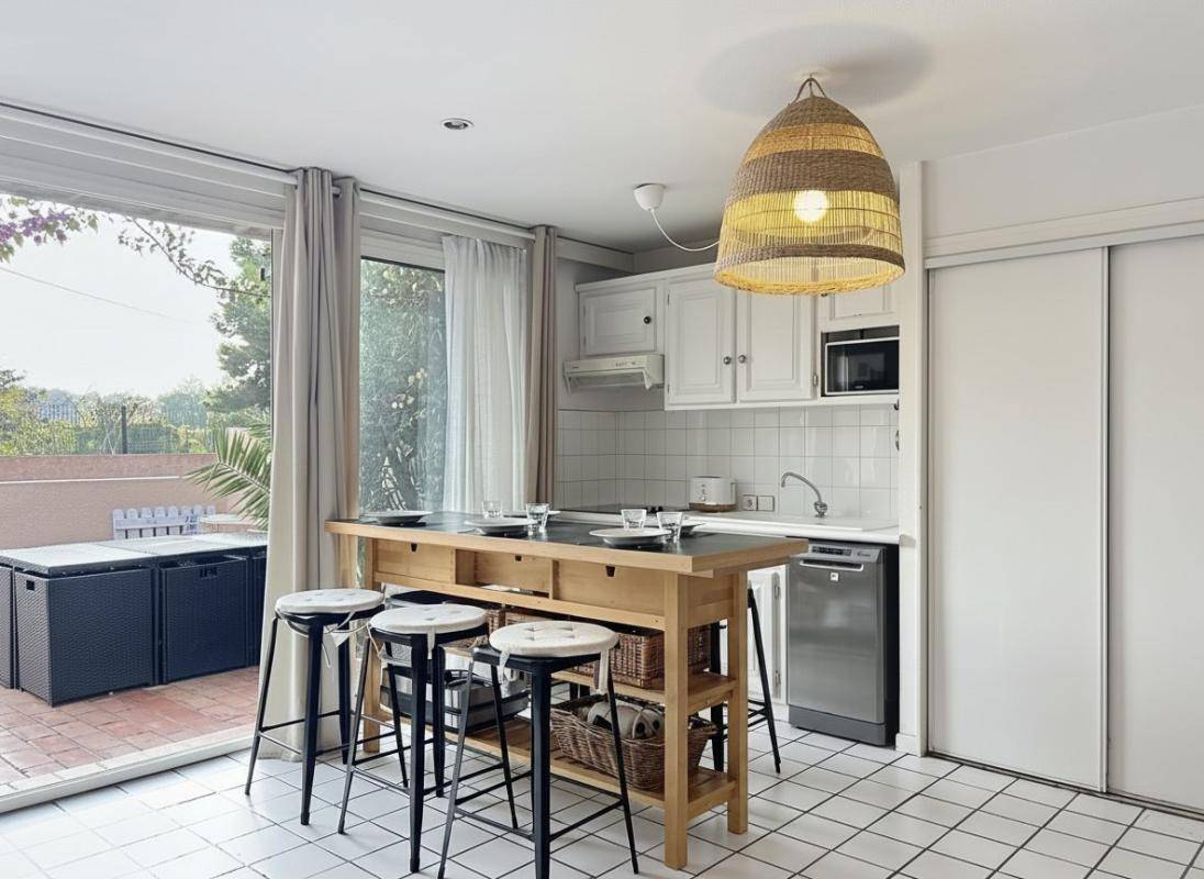 La terrasse donne sur les espaces communs proches de la piscine. Une place de parking privée se trouve juste derrière l’appartement.