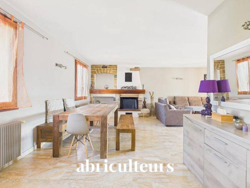 La maison s’articule autour d’un séjour traversant de 44 m² équipé d’une cheminée. Cette pièce communique directement avec la véranda. La cuisine, indépendante, dispose d’un accès à une terrasse de 14 m².