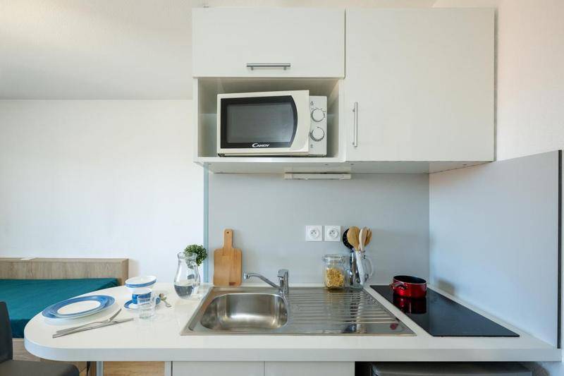 – Equipement du logement étudiant : kitchenette équipée avec plaques vitrocéramiques, réfrigérateur, four à micro-ondes, kit vaisselle ; mobilier complet neuf ; salle de bain avec baignoire et WC.