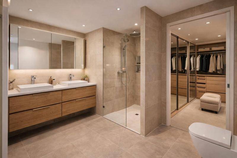 Prestations haut de gamme : parquet massif, carrelage grand format, logement connecté, volets roulants centralisés, cuisine aménagée, placards intégrés avec façades miroir, WC suspendus et douche type « Rain ».