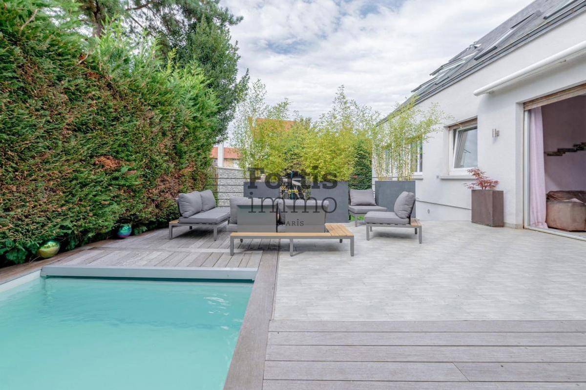 Superbe maison contemporaine développée sur deux niveaux, avec son jardin arboré, sa terrasse (orientée ouest), sa piscine enterrée et son jardin à l’abris des regards.