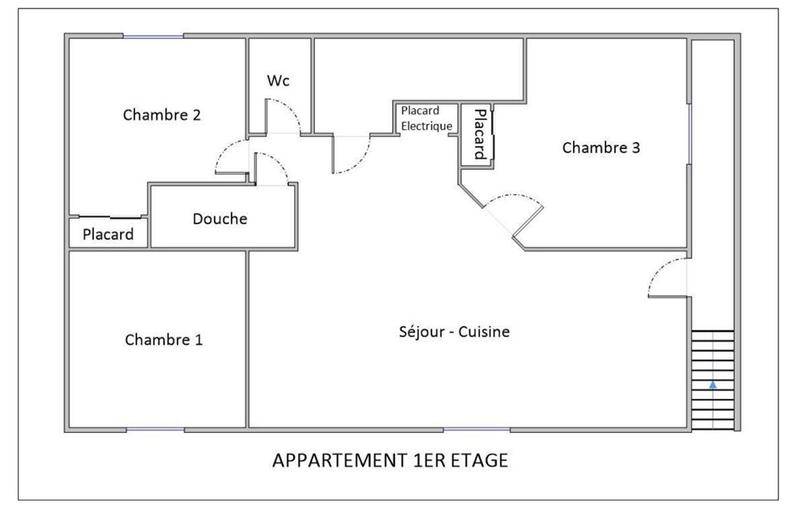 Au premier étage, un appartement de type 3 d’une superficie de 56.78m2 composé d’une pièce de vie avec cuisine aménagée et équipée ouverte, d’une grande chambre, de deux petites chambres, d’une salle d’eau et d’un WC séparé – Libre de locataire.