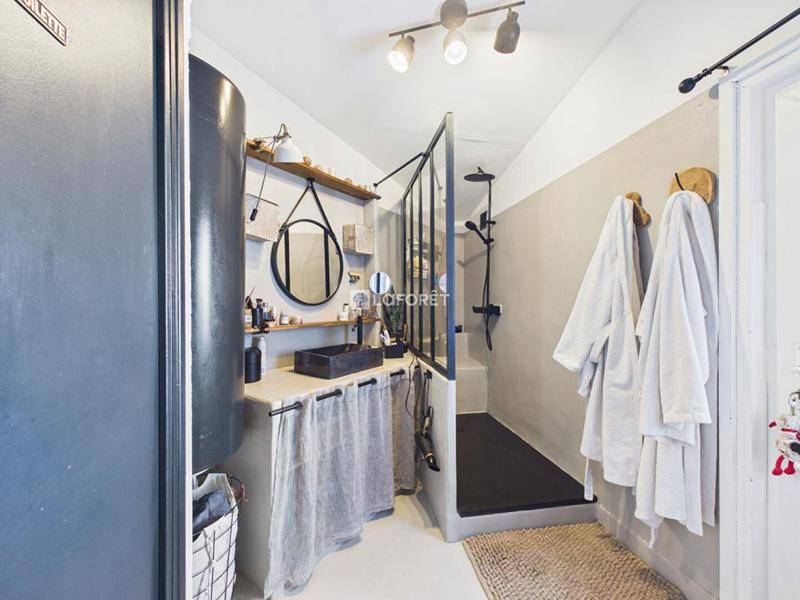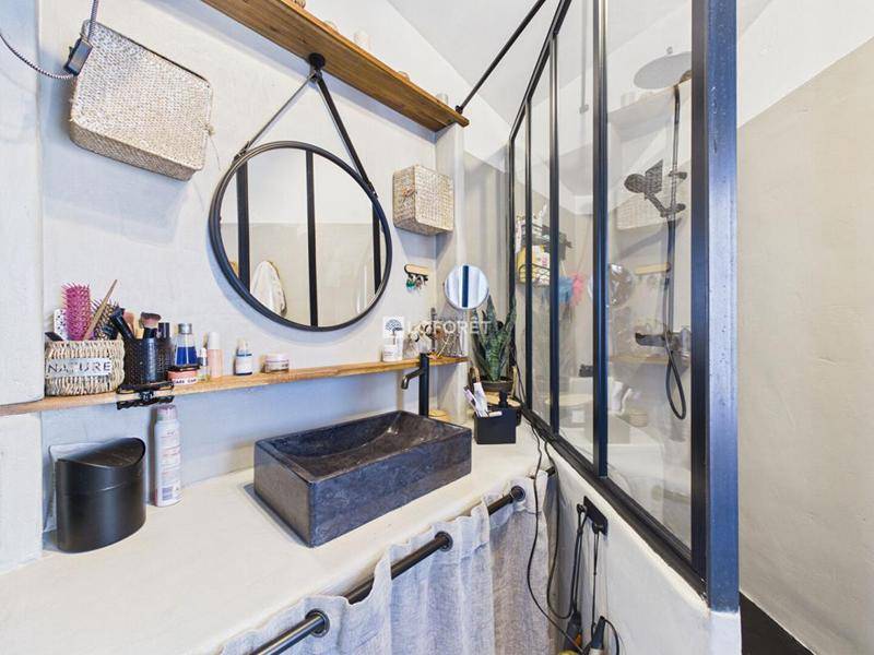 Une chambre de plain-pied de 15,40 m², exposée Sud-Ouest avec parquet, permet une vie de plain-pied confortable. A ce niveau, une salle d’eau moderne de 5,80 m² et un WC indépendant complètent l’ensemble. Les salles d’eau ont été réalisées en résine, apportant une finition contemporaine, élégante et facile d’entretien.