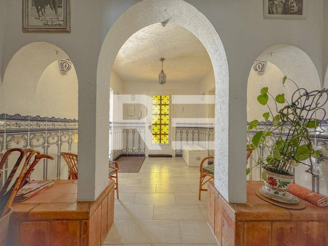 En rez-de-chaussée : un hall d’entrée digne d’une hacienda, desservant un salon d’un côté et un espace séjour/cuisine de l’autre