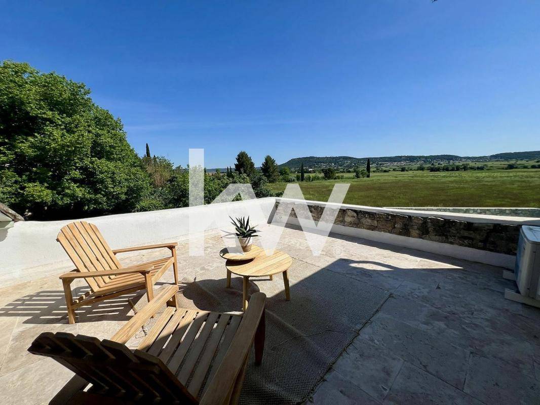 – Deux pièces en enfilade, dont une avec cheminée et mezzanine, ouvrant sur une vaste terrasse tropézienne avec vue sur la campagne et l’Oppidum de Nages-et-Solorgues.