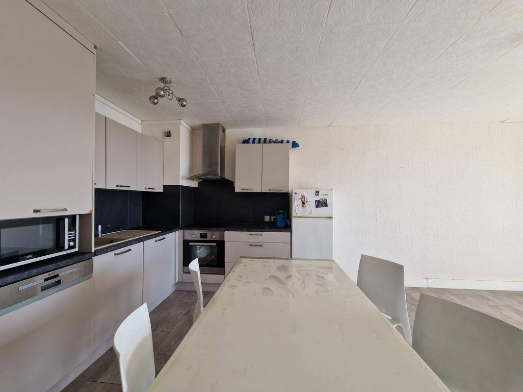 Une entrée dessert le séjour climatisé et sa cuisine aménagée et équipée de 25m² ; nous sommes orientés plein Sud, avec une belle terrasse de 10m² environ avec vue mer, pouvant être fermée par des volets roulants.