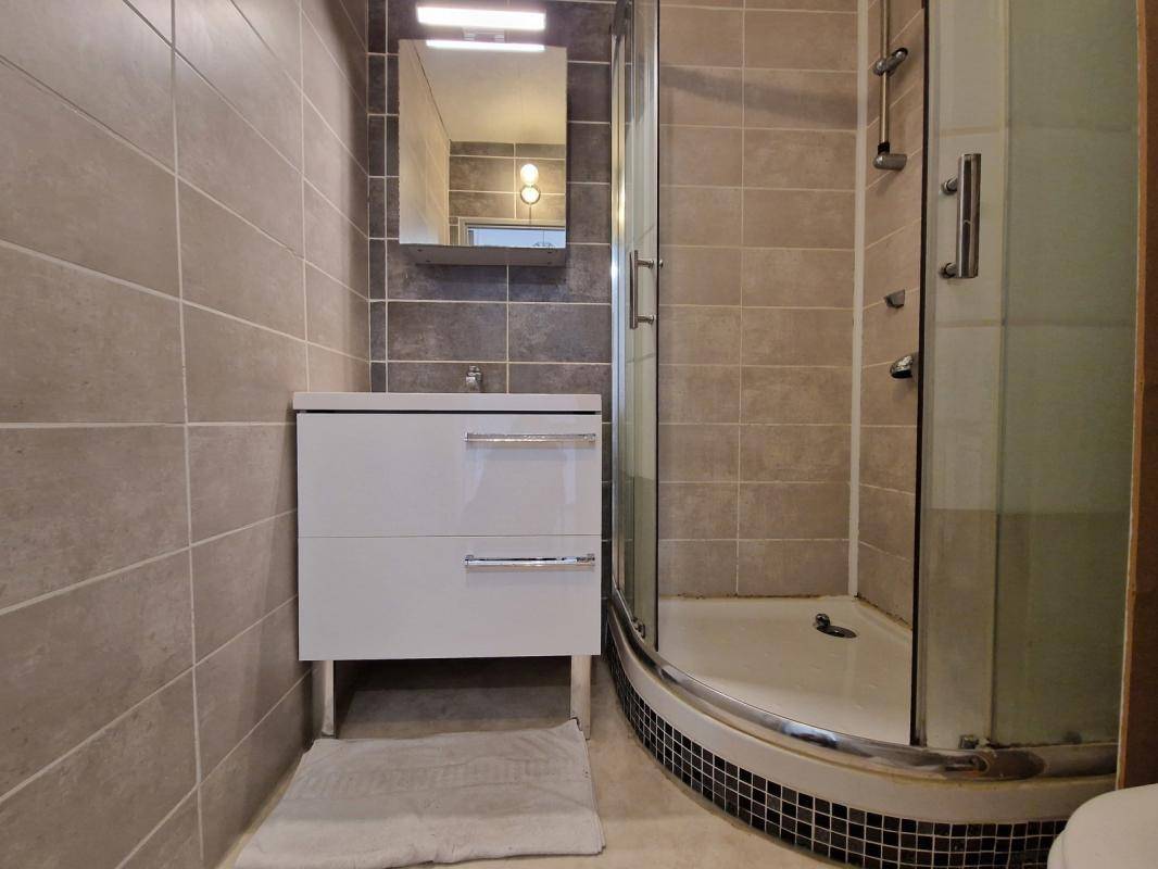 Depuis l’entrée, nous pouvons ensuite accéder à la salle d’eau douche avec toilettes et à la chambre climatisée avec lit double superposé. Elle s’ouvre sur une loggia.