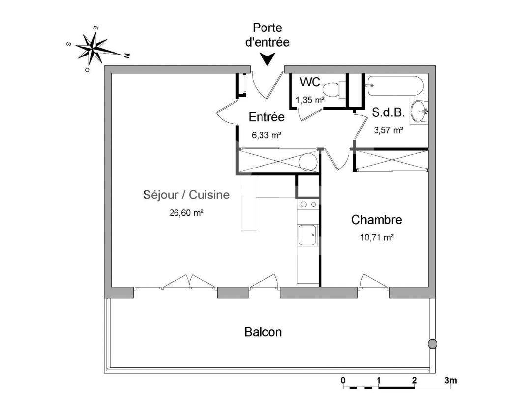 Une entrée avec rangement dessert un grand séjour – cuisine climatisé et lumineux avec accès à la terrasse de 19m². L’espace nuit comprend une chambre dotée de placards intégrés et son accès à la terrasse, une salle de bain avec baignoire et un toilette séparé. (voir plan sur les photos)