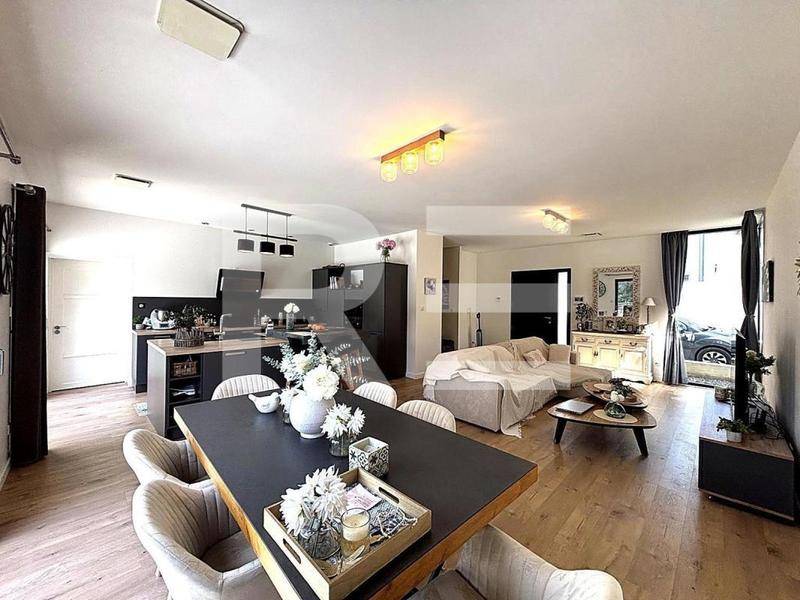 Dès l’entrée, vous serez séduit par une pièce de vie spacieuse et baignée de lumière, avec un salon convivial ouvert sur une élégante cuisine entièrement équipée, pensée pour le confort au quotidien comme pour recevoir.