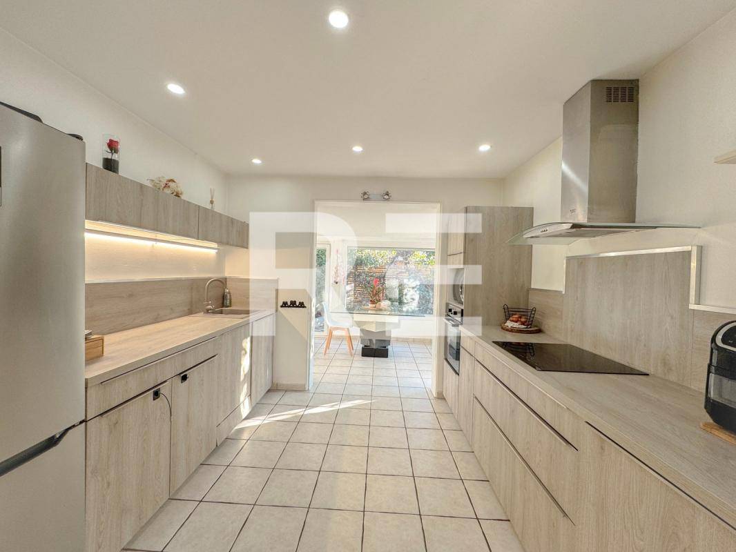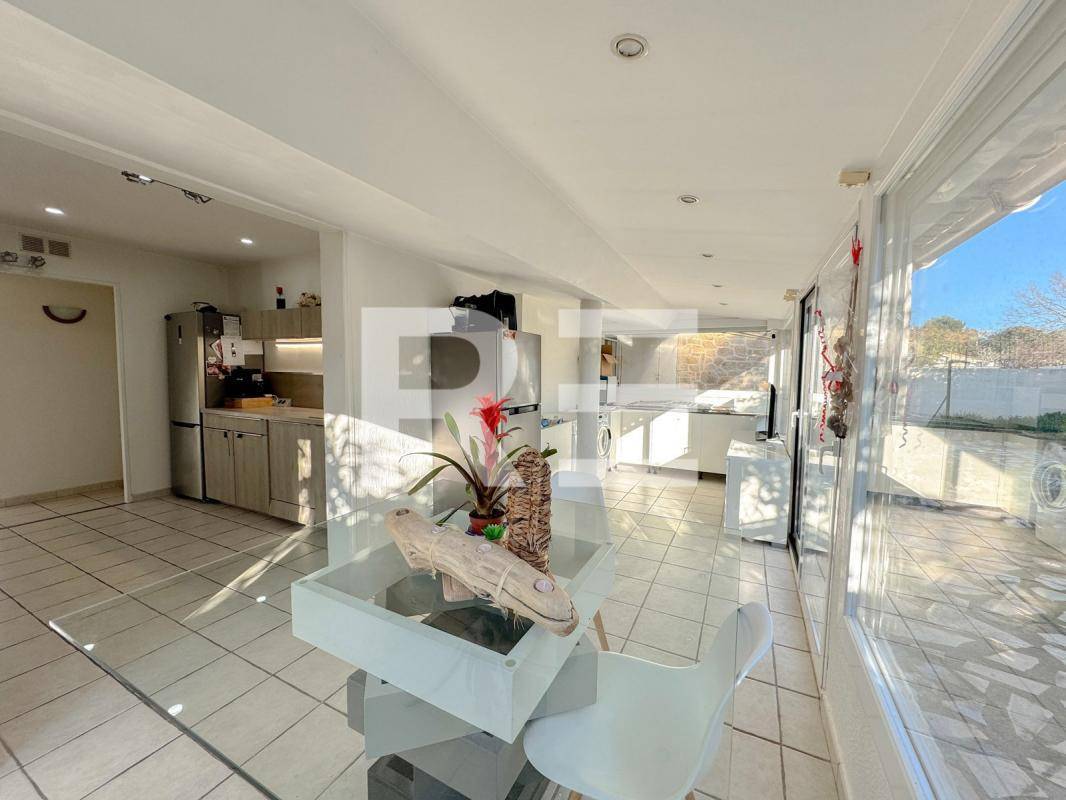 Sur la droite, belle originalité pour cette cuisine actuelle, traversante, donnant accès à un espace salle à manger sous véranda lumineuse (climatisée et isolée)