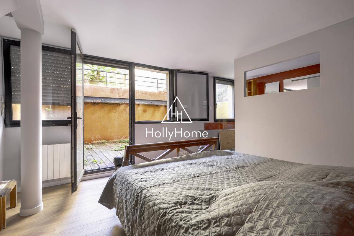 L’appartement d’environ 127 m2 est accessible via une entrée cachée et ouvre directement sur une immense cour privative, offrant un cadre rare et intimiste.