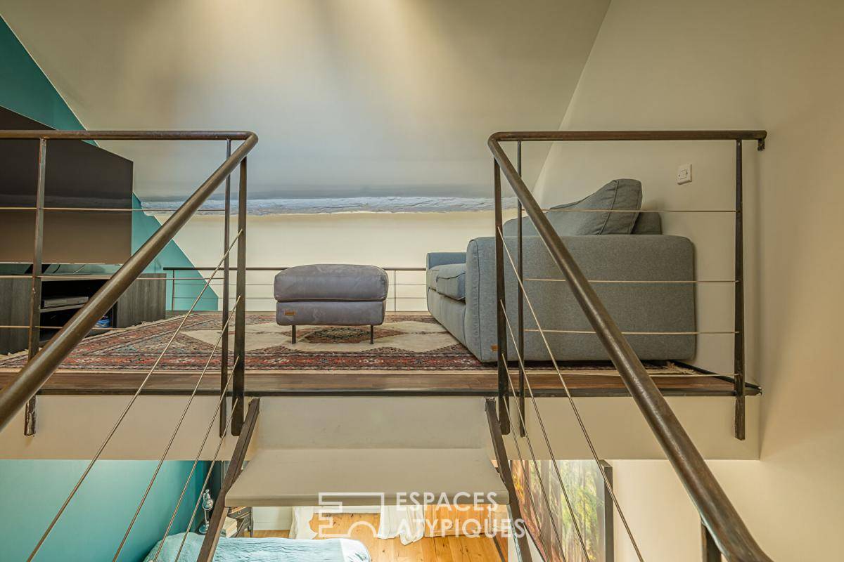 Les deux chambres se situent de part et d’autre de l’appartement. La première chambre offre des volumes généreux et une mezzanine aménagée en espace détente, pouvant faire office de bureau. La seconde chambre, située à l’étage, est issue de l’aménagement des combles et trouve son charme par la présence de jolies poutres blanches.