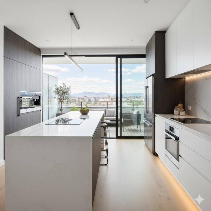 L’espace nuit est composé d’une magnifique suite parentale de quasiment 25 m² avec accès direct à la terrasse, ainsi que de deux autres chambres spacieuses avec leurs rangements intégrés. Toutes les chambres bénéficient d’un accès direct au balcon.