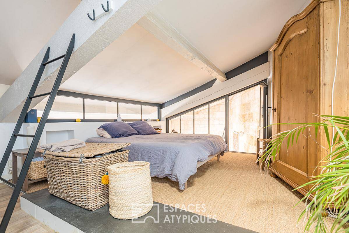 Un escalier ajouré en bois et métal mène au dernier niveau constituant la seconde chambre, également agrémentée d’une salle d’eau.