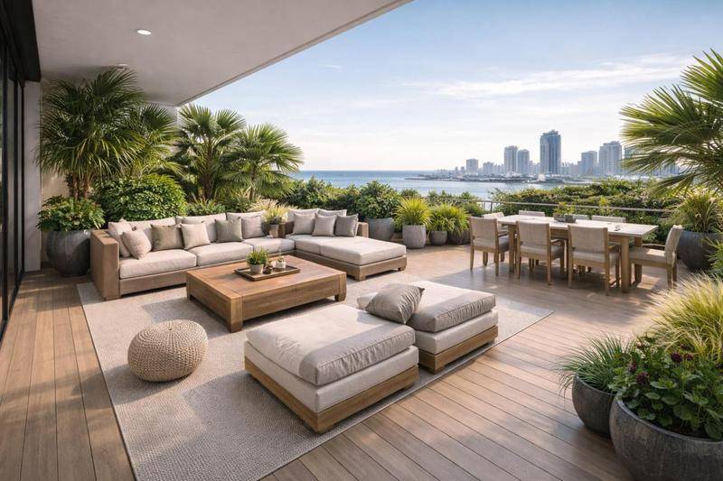 Sa terrasse spectaculaire de 32 m², conçue comme un jardin suspendu, entoure le logement et offre un panorama imprenable sur la canopée un véritable sanctuaire pour vos réceptions en plein air.