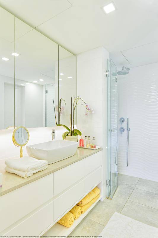 La pièce de vie accueille une cuisine élégamment intégrée, créant un espace convivial et parfaitement fluide. Les trois chambres, idéalement réparties, permettent à chacun de trouver son intimité. La suite parentale, isolée du reste de l’appartement, bénéficie elle aussi d’un accès direct à l’extérieur, renforçant cette sensation de calme et de confort. Les salles d’eau et de bains, modernes et fonctionnelles, complètent un ensemble pensé pour un usage quotidien agréable.