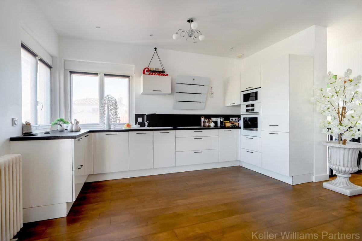 Une vaste pièce de vie baignée de lumière vous accueille. La cuisine ouverte, moderne et entièrement équipée, s’ouvre généreusement sur une grande terrasse, offrant une extension parfaite pour vos dîners estivaux. Ce niveau chaleureux, en parquet massif, se complète par deux chambres spacieuses, une salle d’eau contemporaine et un WC indépendant.