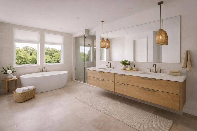 Une salle de bains familiale spacieuse avec baignoire et double vasque.