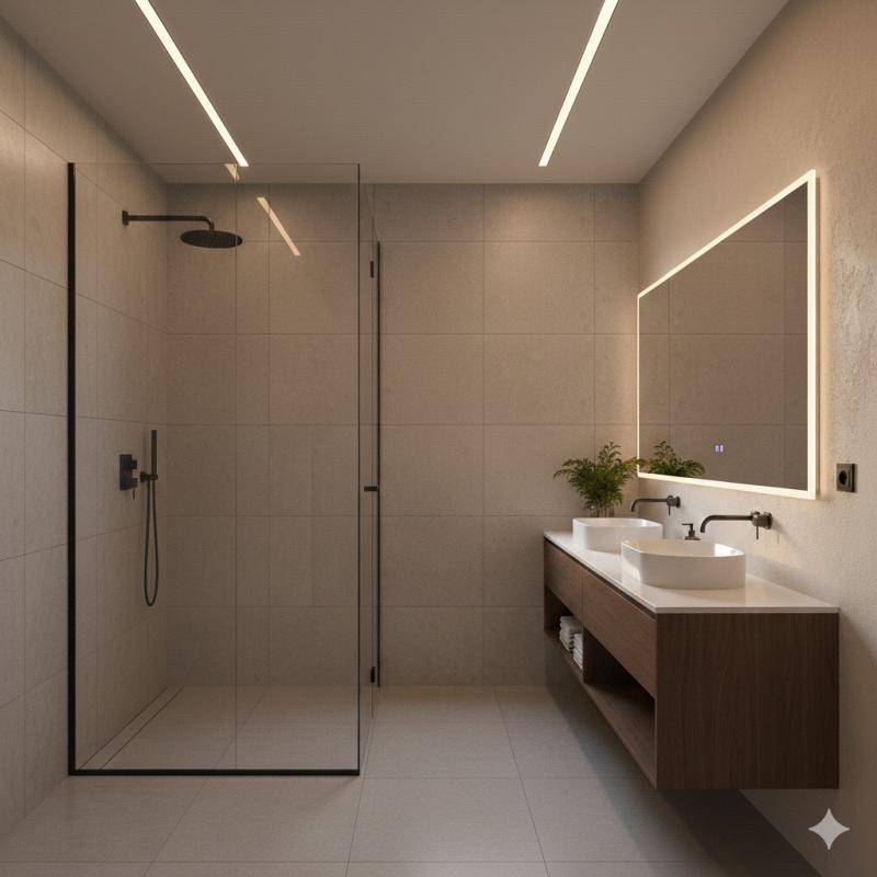 Salles d’eau avec receveur de douche extra-plat, meuble vasque et miroir éclairé.