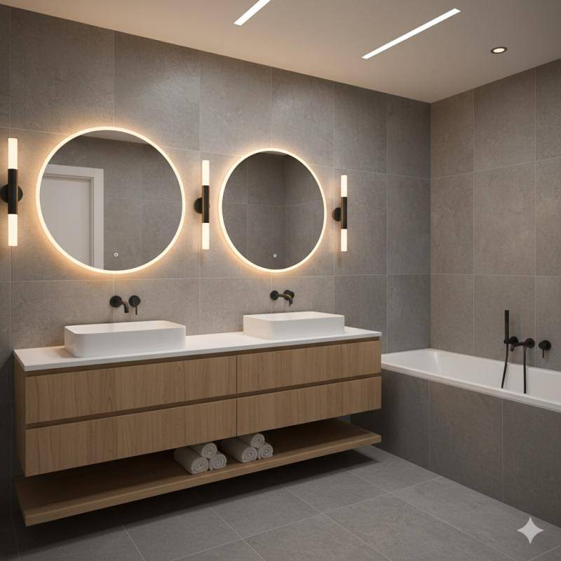 Salles d’eau avec receveur de douche extra-plat, meuble vasque et miroir éclairé.