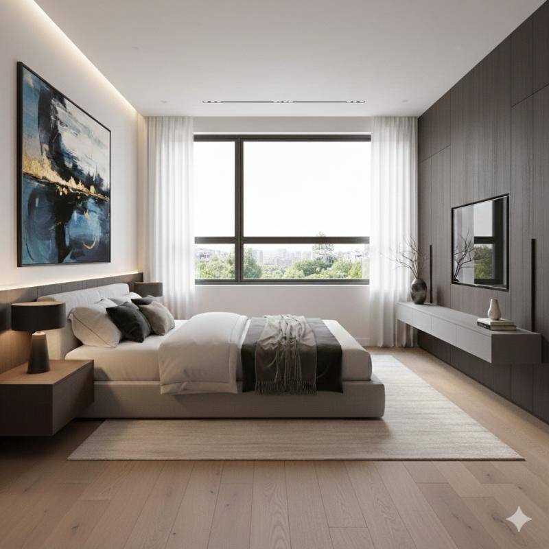 – Revêtements de sols élégants avec carrelage de grande dimension dans les pièces de vie et parquet stratifié dans les chambres.