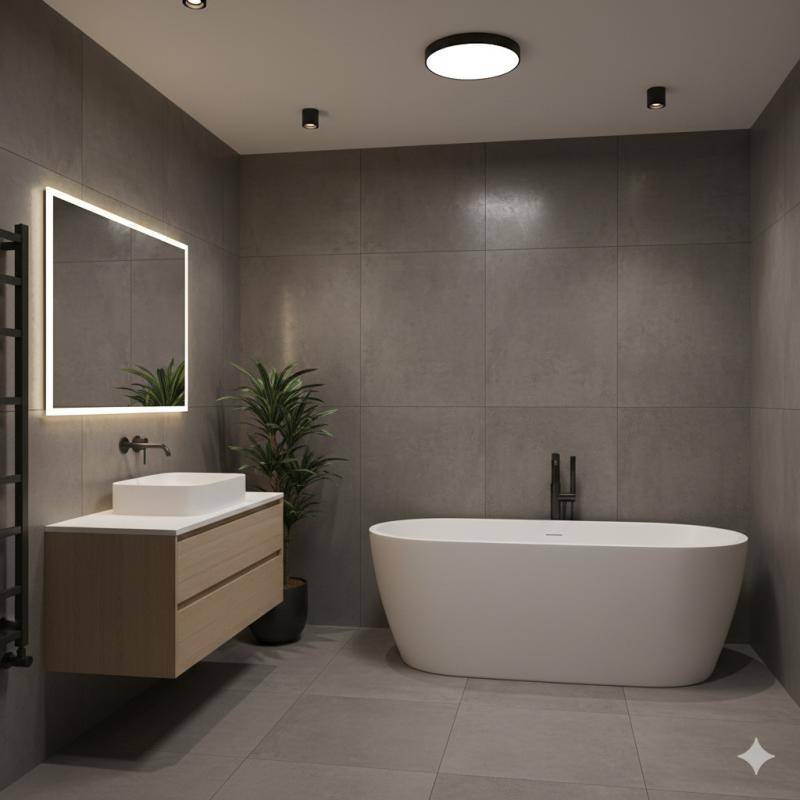 – Salles de bain équipées de WC suspendus avec réservoir encastré et plaque de commande double flux.