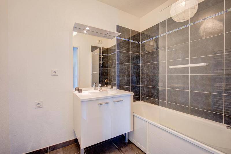 L’appartement dispose de deux chambres, dont une avec placard intégré, ainsi qu’une salle de bains moderne et un WC indépendant.