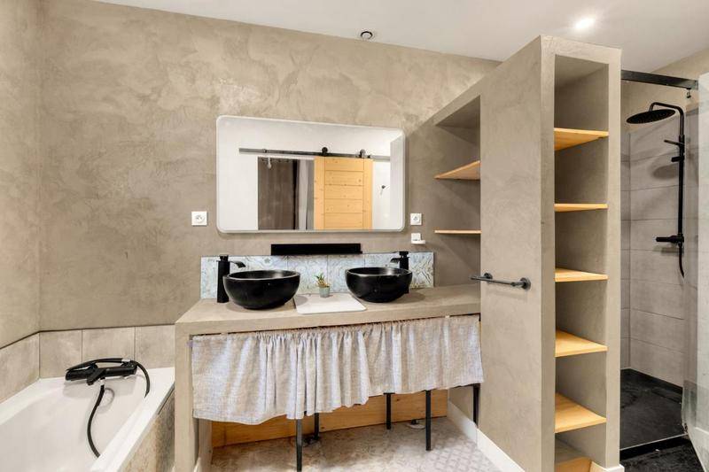 Salle de Bain Signature : Design épuré avec baignoire et une douche à l’italienne en béton ciré (matériau tendance et durable). WC indépendant.