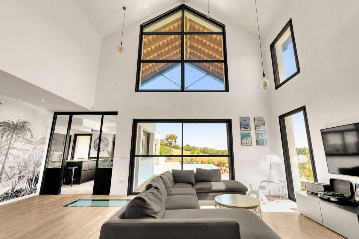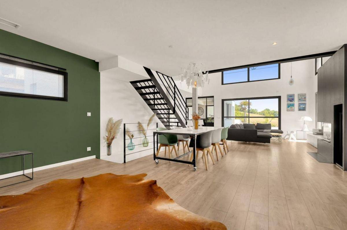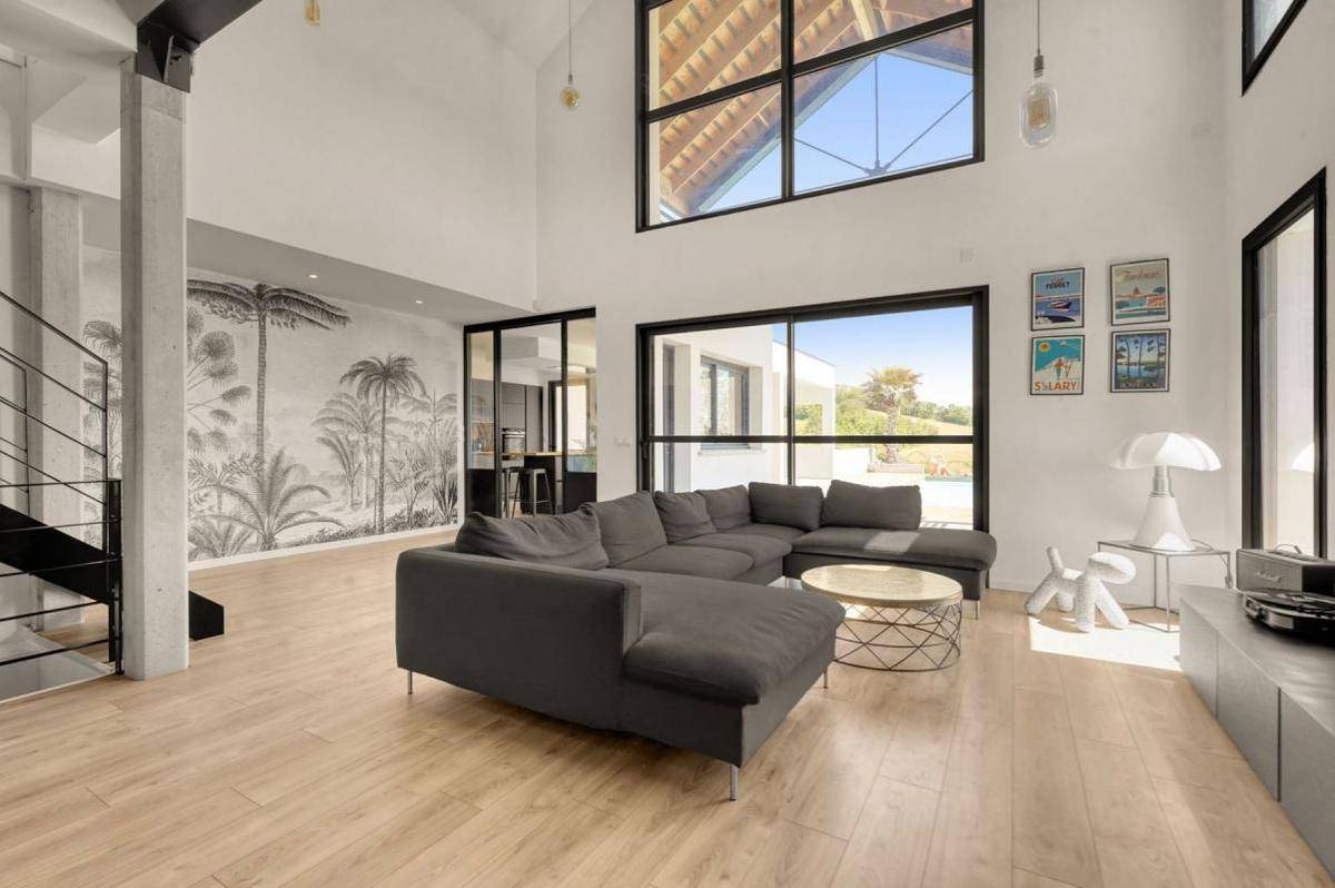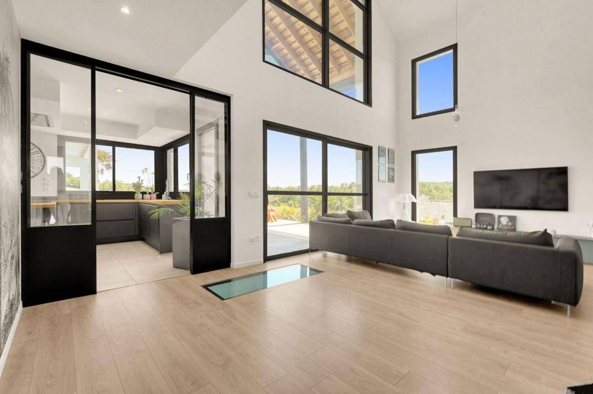 Cette maison d’environ 190 m2 séduit dès les premiers instants par son architecture moderne et ses finitions soignées. La pièce de vie, baignée de lumière naturelle grâce à de larges ouvertures et un plafond cathédrale, offre un espace de réception chaleureux et spectaculaire.