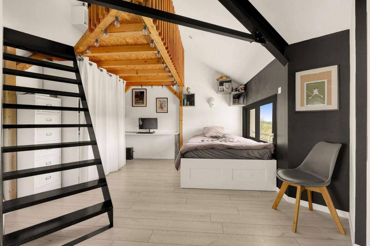 Elle dispose de quatre chambres, dont une suite parentale en rez-de-chaussée, pensée pour le confort au quotidien. Chaque chambre bénéficie de sa propre salle d’eau, un véritable atout pour la vie familiale ou l’accueil des invités. À l’étage, un espace de jeux ou de détente dessert les deux chambres, créant une atmosphère à la fois fonctionnelle et conviviale.