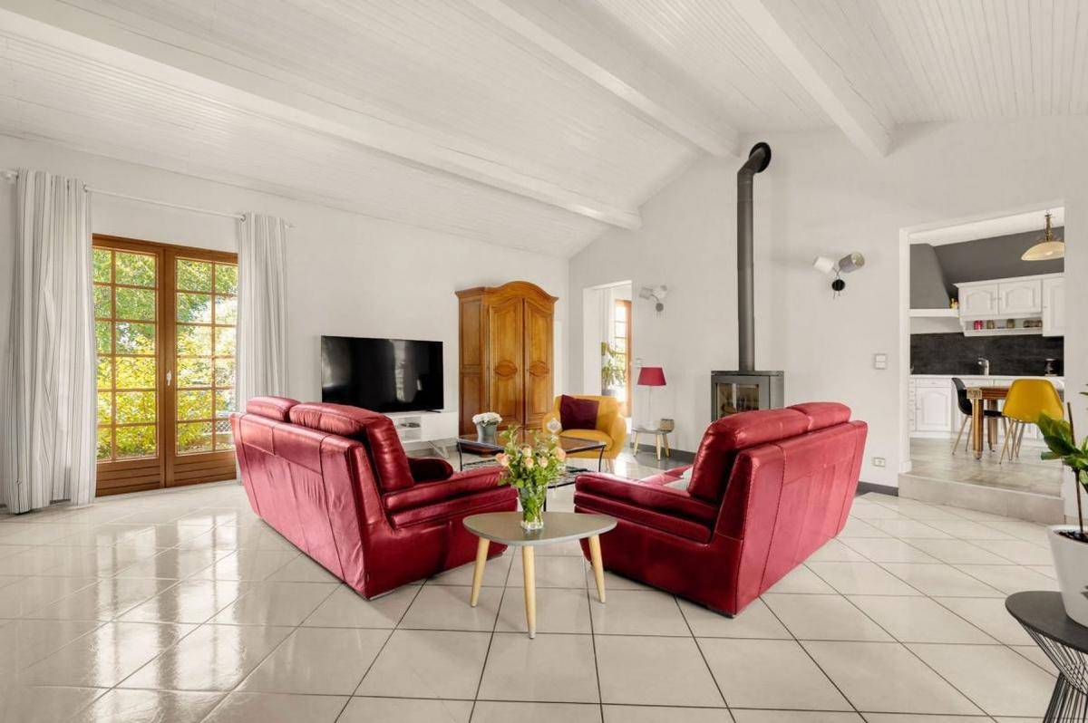 Espace de vie lumineux avec plafond cathédrale, un superbe salon de 35 m² avec poêle à bois, de grandes baies vitrées donnant sur une spacieuse terrasse carrelée et auvent .