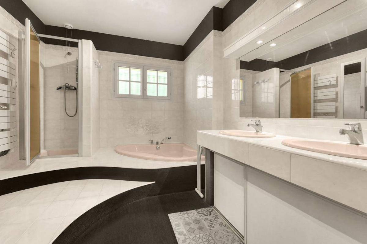 En demi-niveau : 3 chambres avec placards, salle de bain avec douche, baignoire d’angle, double vasque, sèche-serviettes.