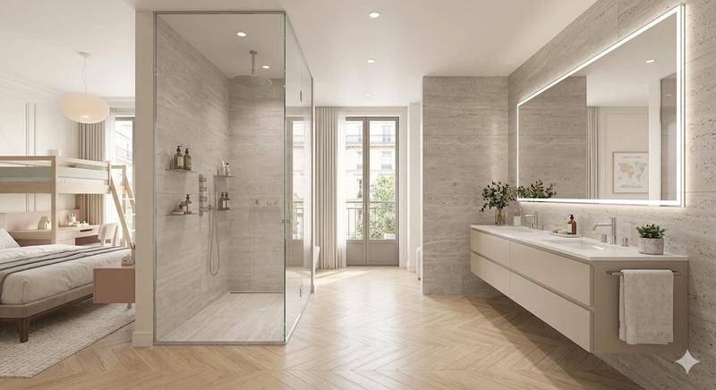 L’espace nuit se compose de trois chambres aux surfaces équilibrées, dont une chambre principale d’environ 13 m². Les deux autres chambres conviennent aussi bien à des enfants qu’à un bureau ou une chambre d’amis.