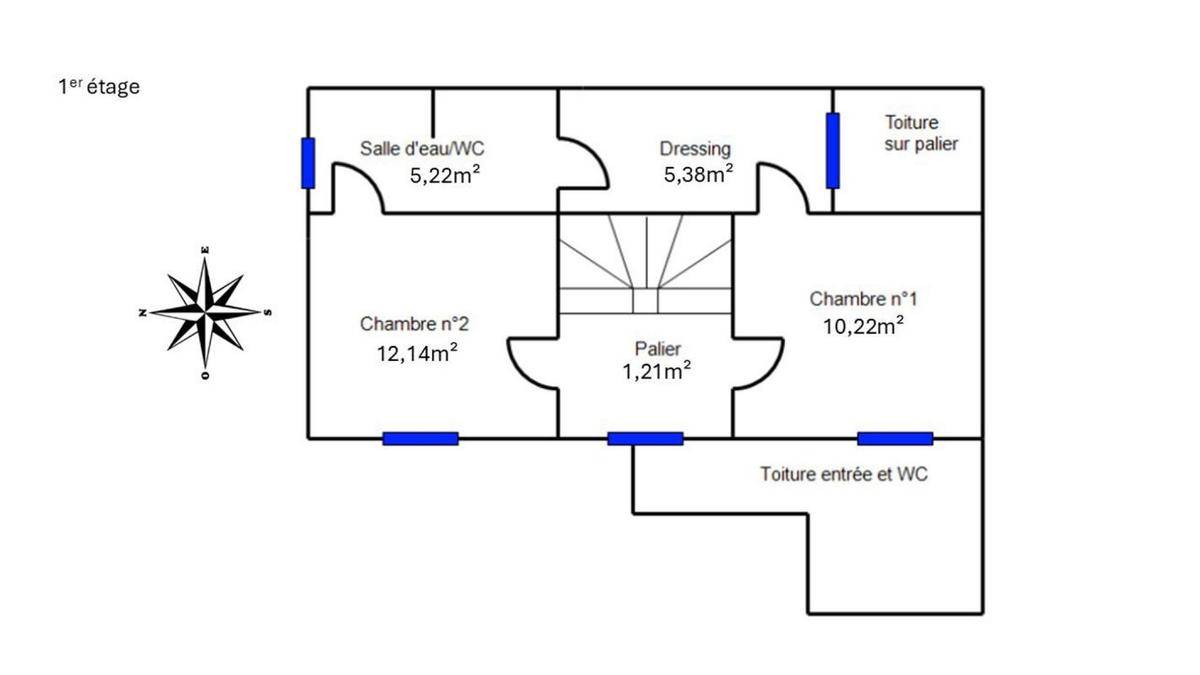 À l’étage, deux chambres confortables, un dressing/bureau et une salle d’eau avec WC complètent l’espace nuit, offrant confort et intimité à toute la famille.
