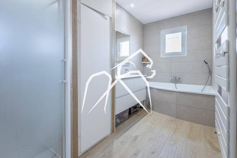 La salle de bain entièrement refaite cette année, devient un véritable moment de pause : baignoire, douche à l’italienne, double vasque pour les matins en famille.