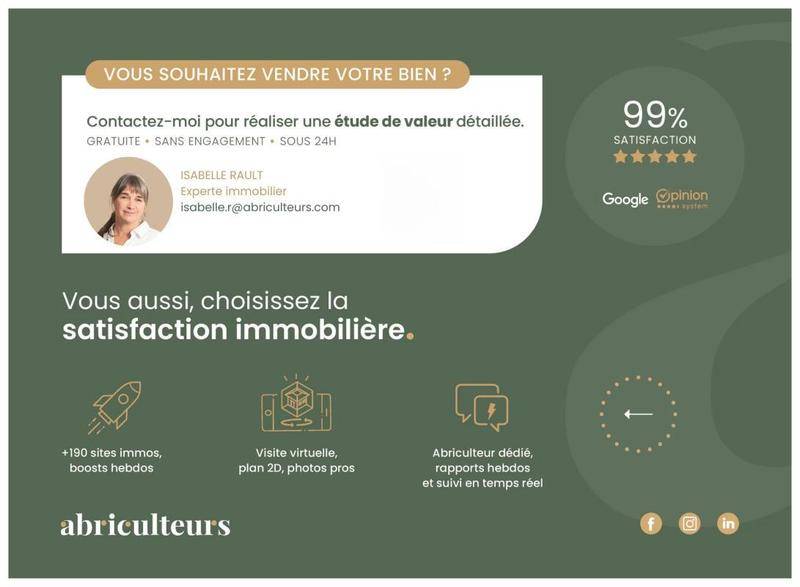 Annonce rédigée sous la responsabilité éditoriale de Mme Isabelle Rault, agent commercial (EI), immatriculé au RSAC de VILLE de Nantes sous le n(Numéro supprimé), sans détention de fonds, agissant pour le compte de la SARL Abriculteurs immobilier, au capital de 5 000 €, immatriculée sous le SIREN n° 837 704 584, titulaire de la carte professionnelle n° CPI 7501 2018 000 025 842 délivrée par la CCI de Paris Île-de-France, dont le représentant légal est M. Adrien Piot, ayant son siège social au 12 rue des Halles, 75001 Paris.