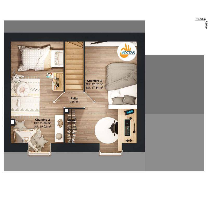 Cette maison de 3 chambres est pensée pour le bonheur de toute la famille. Les enfants apprécieront tout particulièrement l’étage, avec ses deux chambres mansardées, idéales pour s’évader dans leur propre univers. Quant aux parents, ils pourront profiter d’un rez-de-chaussée chaleureux et fonctionnel, conçu pour des moments de détente et de partage en toute intimité. Ce plan a été pensé pour faciliter l’accès à la propriété avec un budget maîtrisé.