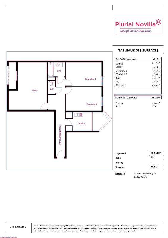 Au 28B boulevard Joffre, découvrez ce T3 de 72,55 m² (loi Carrez), situé au 3e étage avec ascenseur, au sein d’une copropriété sécurisée de 45 logements (dont 22 dans cette entrée)