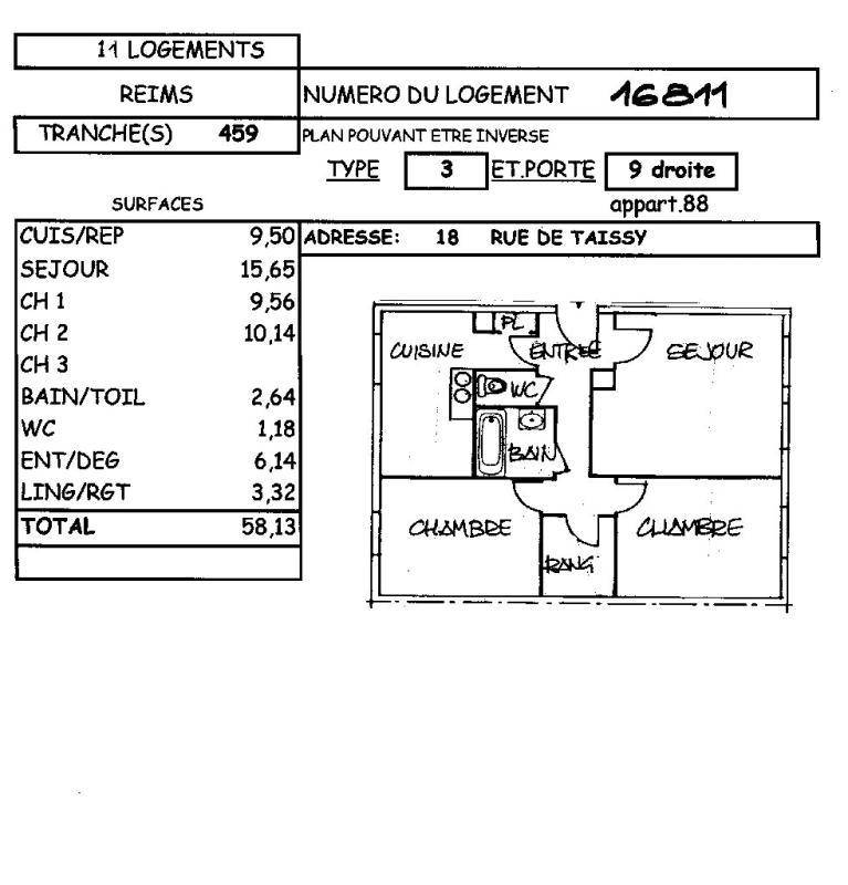 Au 18 rue de Taissy à Reims, DERNIER étage pour ce beau T3 au 9e étage avec vue imprenable de 58,13m2 Carrez, appartement traversant situé au 9ème d’une copropriété de 128 logements avec isolation thermique par l’extérieure réalisée en 2021, comprenant : entrée, cuisine, séjour, possibilité de 2 chambres, salle de bain à créer, WC, rangement, cave – Chauffage collectif – Taxe Foncière 2025 : 959 euros. Charges mensuelles : 190 euros (2284 euros / an) environ. Fond travaux : 128 euros / an.