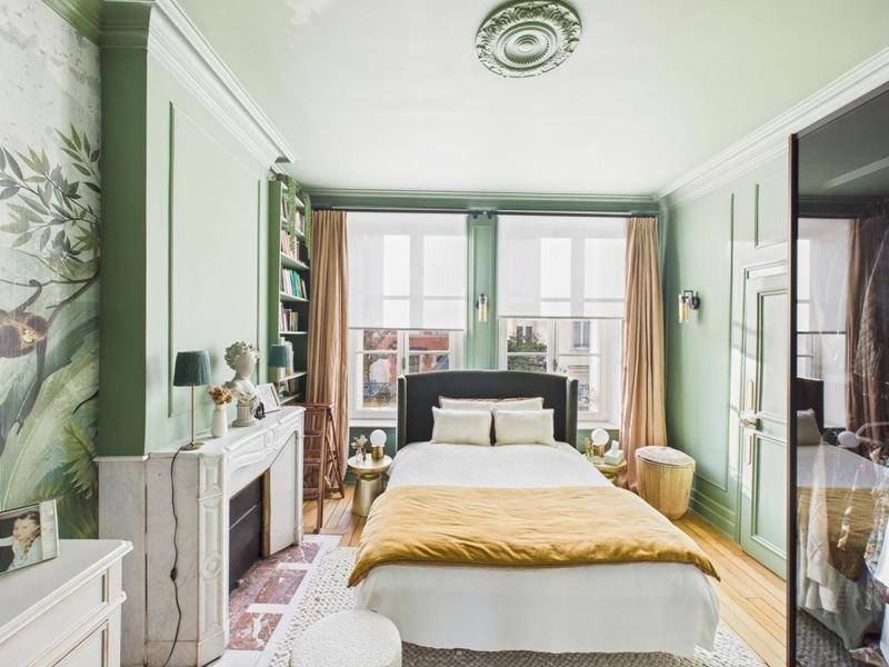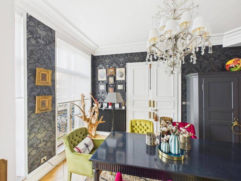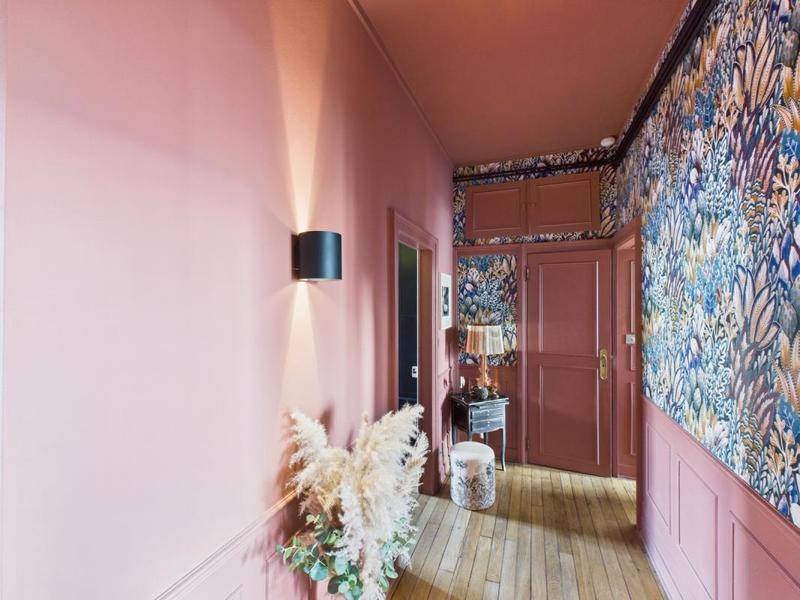 L’entrée dessert une spacieuse pièce de vie lumineuse, sublimée par une décoration soignée, des hauteurs sous plafond de 3 mètres, des moulures, un parquet ancien et une cheminée, créant une atmosphère raffinée et élégante.