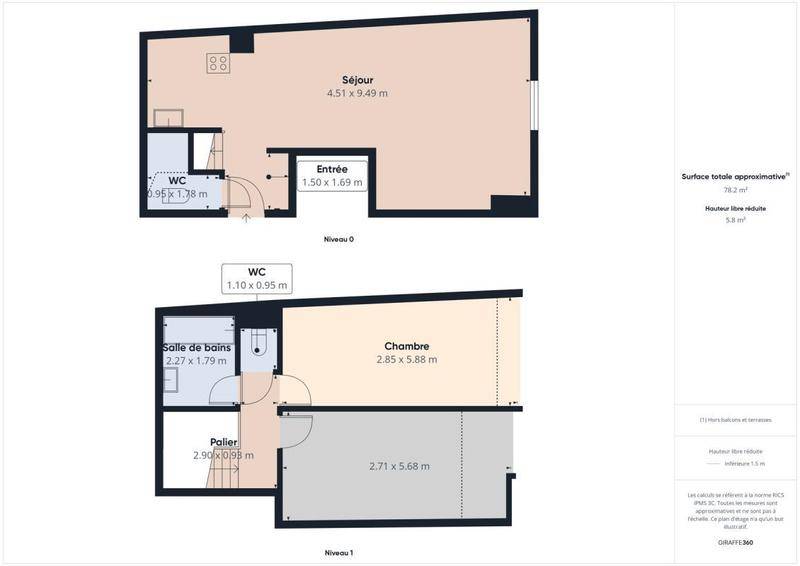 Cet appartement, d’une surface de 69 m2 carrez (85 m2 au sol) se compose de :