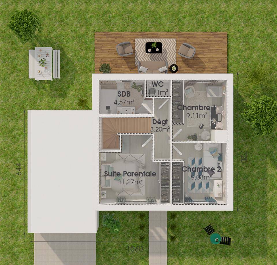 Cette maison comporte 2 niveaux. Son intérieur est composé de trois chambres, d’une cuisine et d’une salle de bains.