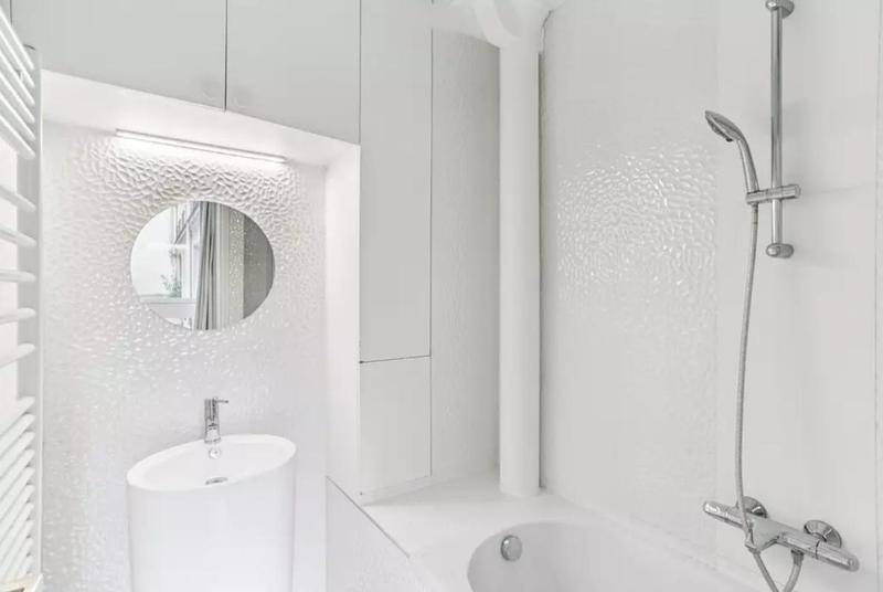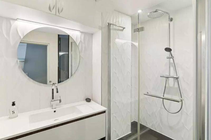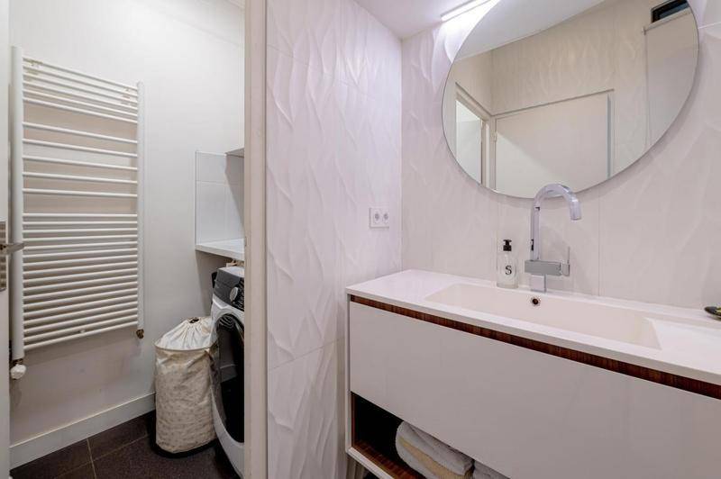 L’appartement offre un séjour lumineux sur rue avec de larges baies vitrées, intégrant un espace bureau discret parfaitement aménagé. Les volumes ont été optimisés avec soin et les perspectives subtilement travaillées pour un cadre de vie à la fois esthétique et fonctionnel.