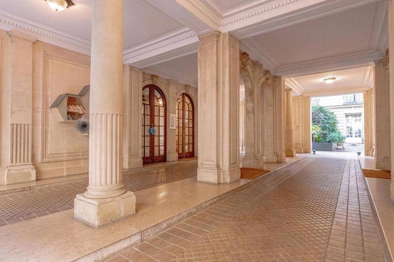 La vue intégrale sur la grande cour arborée, visible depuis les principales pièces, crée une sensation de calme et de retrait rare en plein Paris. Un véritable luxe pour qui recherche inspiration, confidentialité et qualité de vie.