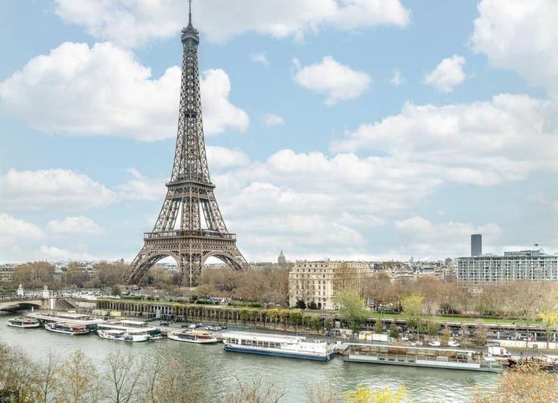Inondé de lumière, le séjour se distingue par une vue spectaculaire sur la Seine et la Tour Eiffel. Il s’ouvre sur une cuisine contemporaine, entièrement aménagée et équipée, conçue avec un soin particulier alliant esthétique et fonctionnalité.
