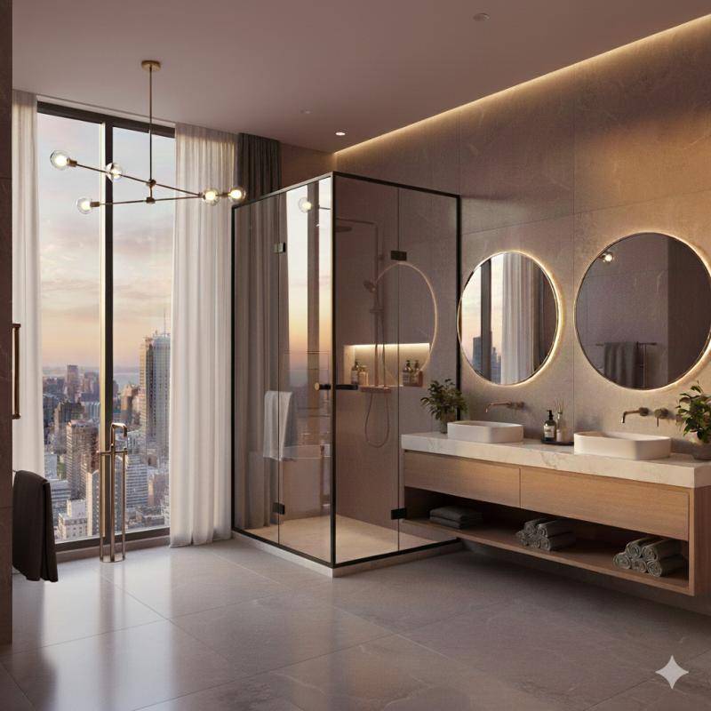 On the lower level (5th floor), the night area features three spacious bedrooms, a bathroom, a shower room, and a separate toilet. Each room opens onto a continuous balcony, creating a calm and elegant atmosphere.
