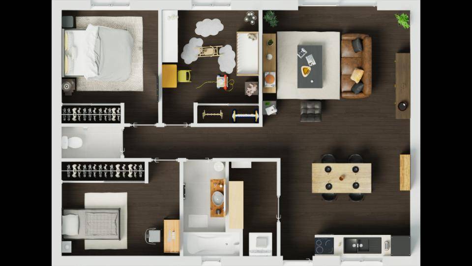 Elle inclut trois chambres, une cuisine et une salle de bains. Cette maison est neuve.