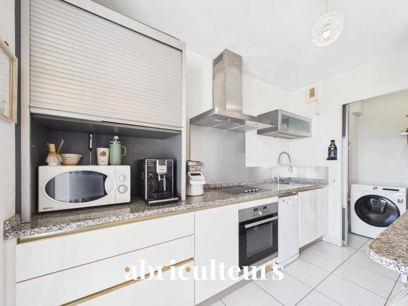 Depuis cet espace vous accédez à une cuisine fonctionnelle ouverte vous permettant de préparer et prendre vos repas en toute convivialité, jusque sur la terrasse attenante.