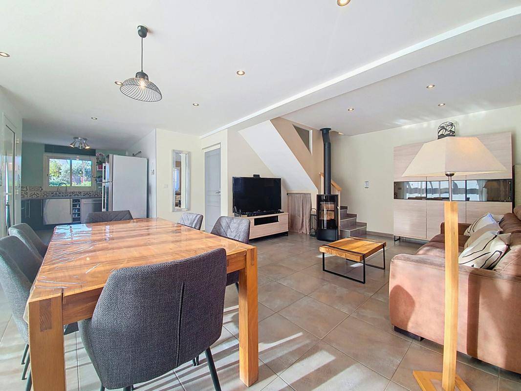 La maison offre des espaces de vie pratiques et agréables, avec un séjour lumineux et climatisé, 4 chambres spacieuses permettant à chacun d’avoir son intimité, et un poêle à bois qui ajoute une touche chaleureuse pour les soirées en famille. Les volets roulants électriques centralisés facilitent le quotidien, et le garage assure un stationnement sécurisé.